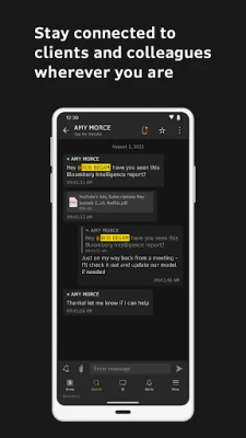 Stay connected to breaking news, markets, clients and colleagues with on-the-go access to key Bloomberg Terminal functionality.